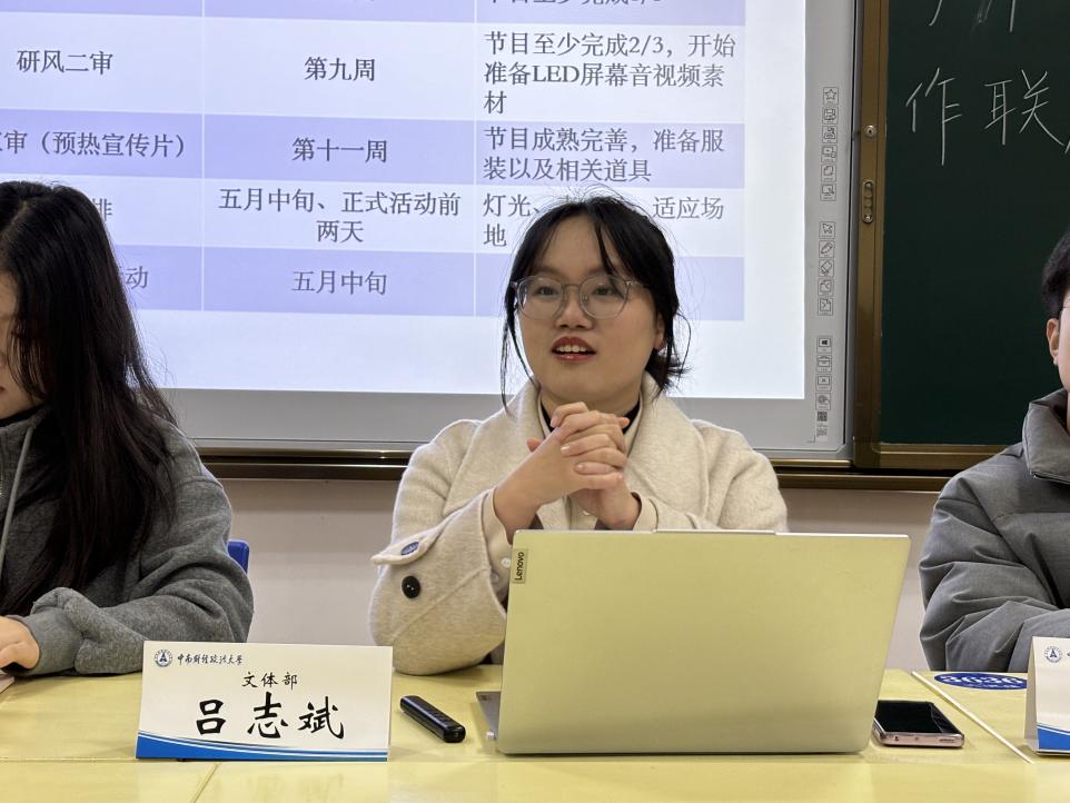 会议伊始,校研究生会文体部负责人靳思遥介绍了新学期文体工作计划,重点围绕研究生风采大赛、“青研杯”羽毛球赛、“周末健身舞”三大活动的筹备进展进行说明。校研究生会文体部成员王安琪、郑文文、邢继扬三位同学就研究生风采大赛和“青研杯”羽毛球赛的活动细则展开了详细说明,重点介绍了研究生风采大赛的三轮审核及彩排的日程安排、“青研杯”羽毛球赛的赛制安排创新等内容。