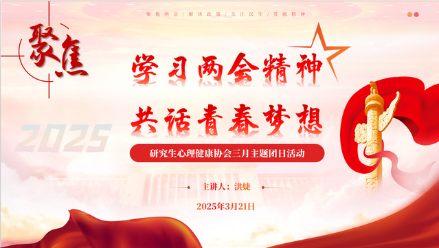 至此,本次“学习两会精神、共话青春梦想”主题团日活动结束。这次活动不仅加深了同学们对两会精神的理解,营造了浓厚的两会精神学习氛围,也为大家提供了一个交流思想、凝聚力量的平台。相信在未来,研究生心理健康协会的同学们将以更加饱满的热情和坚定的信念,强化理论武装,追逐青春梦想,为国家和社会的发展贡献青春智慧与力量。