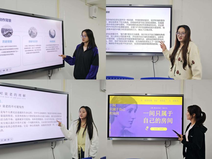 本次活动中,6位参与同学以“美文共欣赏,心得大家谈”为主题,围绕各自阅读的书籍展开了精彩分享。万自力同学分享了书籍《伊甸之东》,通过对作品创作背景、情节人物等的全景式分析,展示了作者对善与恶永恒主题的探讨;朱佳怡同学向大家分享了书籍《巴菲特传》,深度解析了“股神”巴菲特的成功历程与人生哲学;杨祺同学分享了书籍《最好的告别》,向我们展示了书中对衰老的理解和对生命质量与尊严的思考,启发我们重新审视生命的价值;李俞锋同学分享了书籍《一间只属于自己的房间》,启迪我们要放下性别偏见,多看看不同的世界,成为任何自己想成为的人。