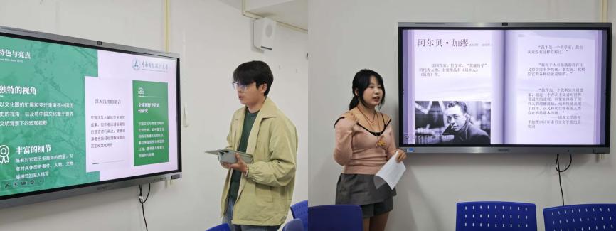 接着,贾一同学分享了书籍《万古江河》,该书从中华文明的起源着手,系统展示了中华文化内容的丰富与多元,从全新的视角审视了中国的历史和文化;杨珊珊同学分享了书籍《局外人》,通过对原文精彩的转述与解析,让我们领略到了加缪的“荒诞哲学”。分享结束后,同学们互相交流了读书感悟,活动现场气氛热烈。