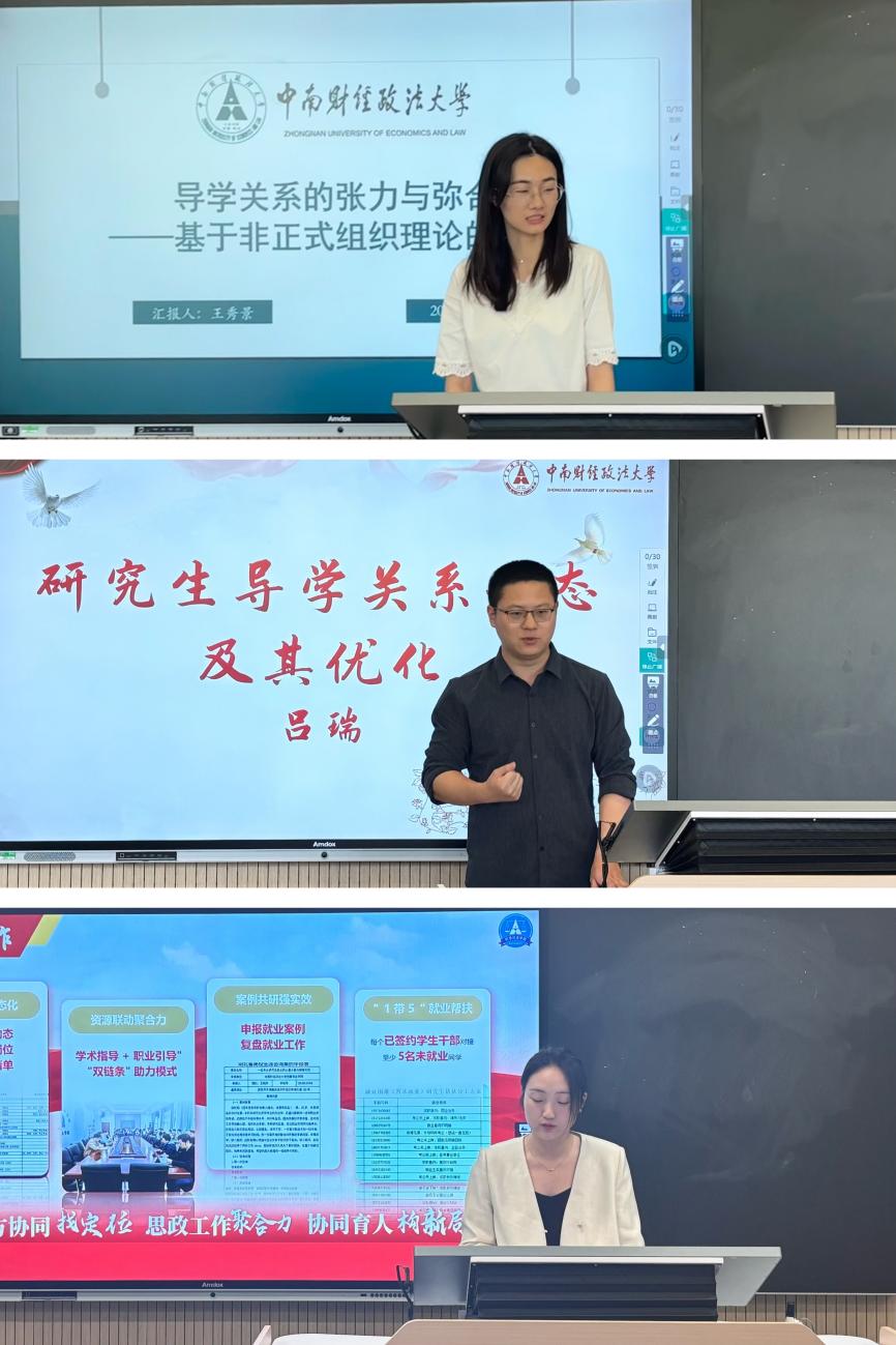 本次活动特设案例研讨环节,三位研究生辅导员结合工作实际做案例分享。金融学院研究生辅导员王秀景老师以“导学关系的张力与弥合”为题,围绕导学关系张力来源、生成机理以及导学关系的弥合三个方面展开讲述并介绍通过识别矛盾类型和阶段、分阶段干预、完善制度保障、提升自身能力等方式促进导学关系的良性发展。国家治理学院研究生辅导员吕瑞老师案例以辅导员视角引入,做“博导与博士生、硕士生以及新聘硕导与硕士生”三种重点关系结合工作实际形态分享并介绍分享如何在制度框架内优化导学关系,培育尊师重道的导学思政共同体文化的经验做法。刑事司法学院研究生辅导员王晓丹老师从借“学科”之力、借“骨干”之力以及借“导师”之力三个方面谈及如何开展协同育人工作。她介绍学院“法治教育+价值引领+实践育人”三位一体活动体系并注重从选拔、培训、协同、考核激励等多方面发挥学生骨干激励作用,与导师一道构建学生就业支持共同体,多措并举助力学生就业。