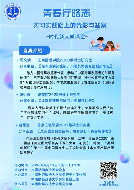 5月13日(周二)时代新人微课堂:研究生实习实践经验分享交流会与你共话职场成长之路!