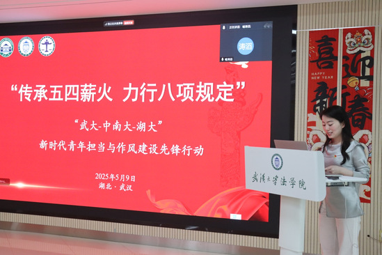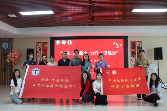 (通讯员 付慧娟 张琼 任文佑 万雯 摄影 吴雅婷)为深入学习贯彻习近平新时代中国特色社会主义思想,进一步学习贯彻中央八项规定精神,提升理论宣讲水平、践行新时代青年使命担当,中南财经政法大学研究生宣讲团受邀于2025年5月9日上午赴武汉大学开展“武大-中南大-湖大”校际联合宣讲。