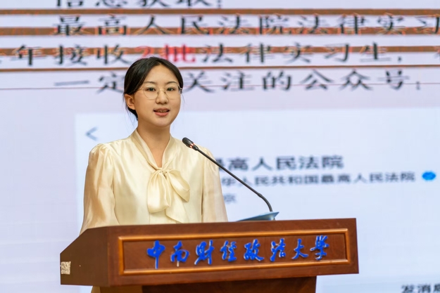 “每一份裁判文书都承载着公平正义的使命。” 作为最高人民法院第十五批法律实习生暨“优秀法律实习生”荣誉获得者,张怡歌分享了她在最高审判机关的实习历程。在为期四个月的实习期间,张怡歌以细致严谨的态度参与重大案件辅助工作,于理论与实践的交融中探寻法治内涵。她详细介绍最高人民法院法律实习生选拔的核心标准,为同学们分享自我能力提升的清晰路径,鼓励大家以专业精进为目标,在理论与实践的深度融合中锤炼素养、实现成长。