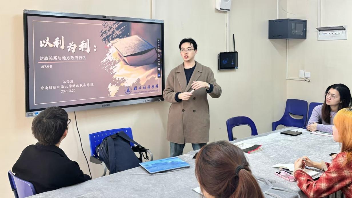 (通讯员 任怡洁 摄影 赵文慧)春意渐浓,万物生发。为深化书香校园建设,营造浓厚学术氛围,搭建思想交流平台,党委研究生工作部推出“春风拂书,书香漫游”读书分享会系列活动。3月20日下午13:45,财政税务学院于望湖驿站113会议室承办开展首期读书分享会,财政税务学院江俊澄同学为大家带来《以利为利——财政关系与地方政府行为》经典著作分享。本次活动邀请财政税务学院辅导员翟紫薇老师作点评。