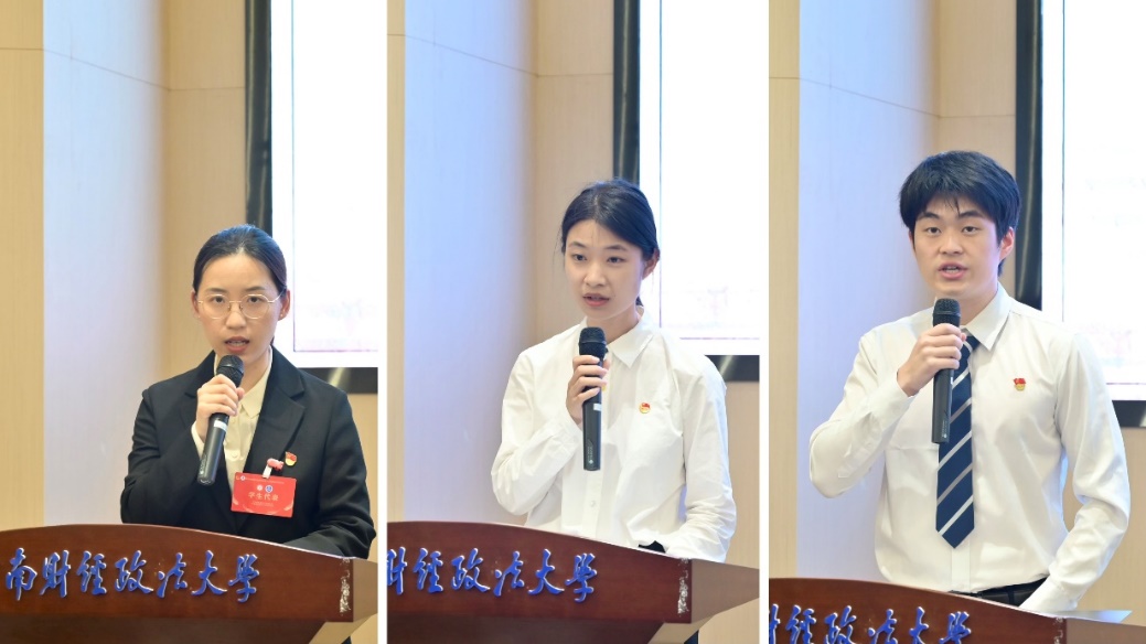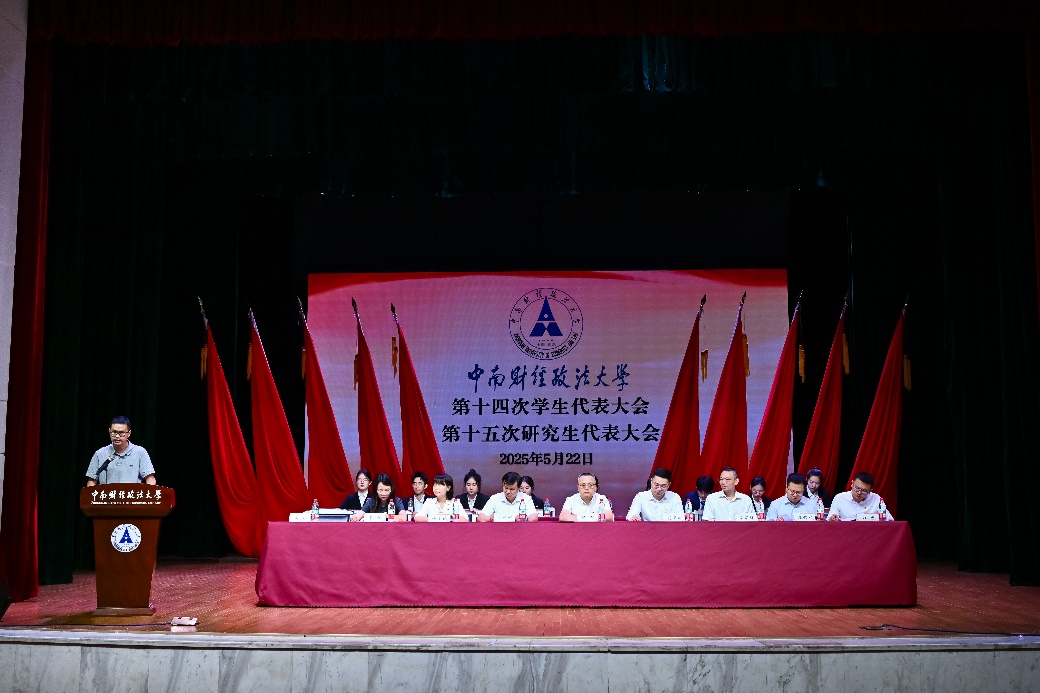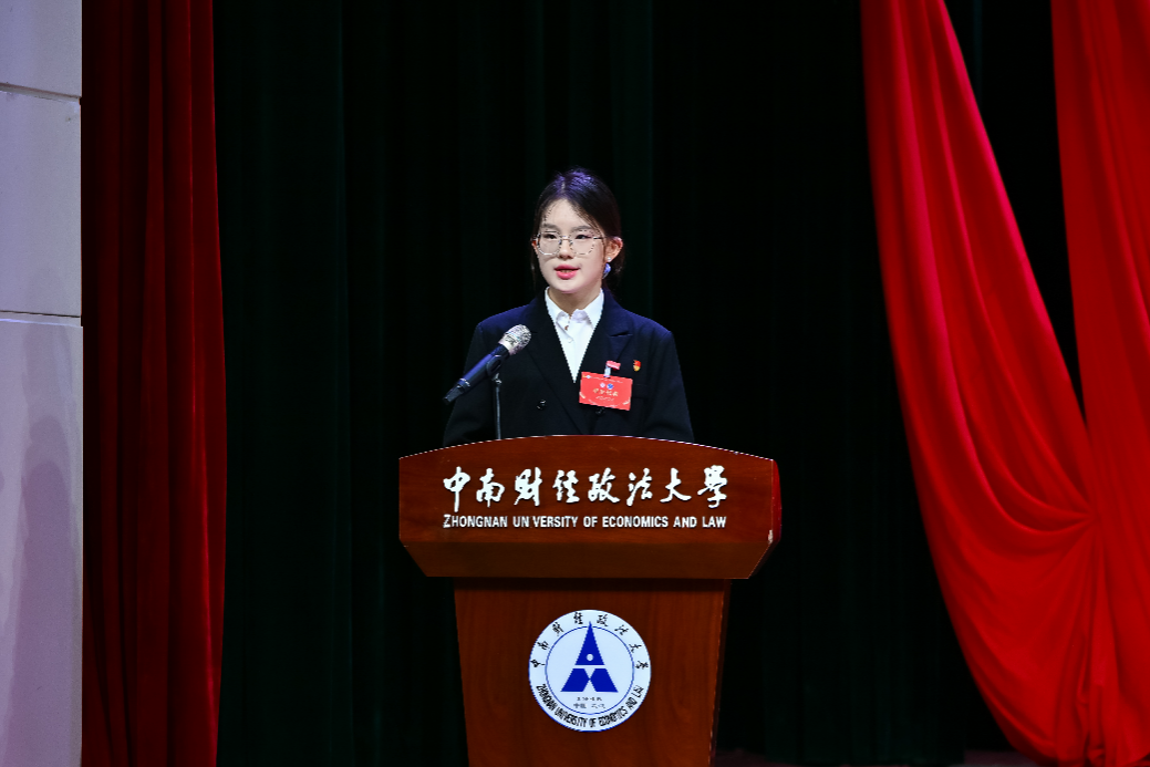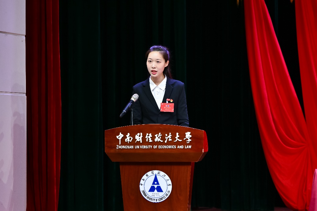 在大会第一次全体会议中,第四十届校研究生会主席团成员黄千芷作题为《强国建设 青年有为 团结带领广大研究生将青春奋斗融入民族复兴伟业 在中国式现代化建设中挺膺担当》的工作报告,从党建领航强化思想引领、数智赋能推进组织建设、聚焦前沿打造学术精品、立足需求深化社区服务、文体两翼促进全面发展、校际联动增强服务效能等方面,全面回顾总结了校研究生会在过去一学年的工作实践与成果。第十四次研究生代表大会常任代表姚子佳作《中南财经政法大学第十四次研究生代表大会常设机构工作报告》。第四十届校研究生会主席团成员严宇飞作《中南财经政法大学第十五次研究生代表大会提案工作报告》。