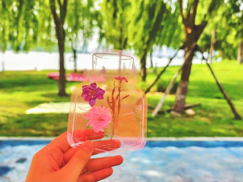 花语呼吸站:成为浮躁心绪的“沉淀之所”,同学们在干花书签制作中轻触自然芬芳,于透明贴纸与花叶的搭配间构筑专属心灵信物,让手工创作成为安抚情绪的温柔媒介。