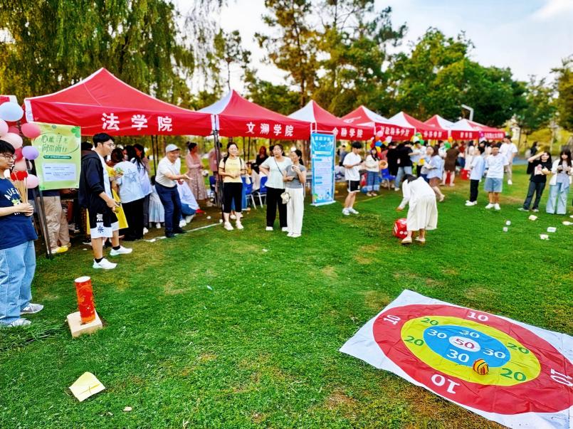 沙包飞舞映晴空:唤醒童年记忆,靶盘投掷间既有竞技的紧张感,亦有重温儿时游戏的轻松愉悦,同学们在沙包的抛物线中抛却烦忧,让压力随飞扬的沙包散落在春日晴空。