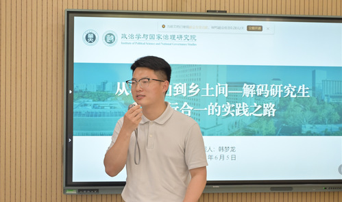 韩梦龙老师以《从桂子山到乡土间—解码研究生知行合一的实践之路》为题,从“三个坚持”筑牢实践根基、“四个突出”深化育人内涵、“五个一工程”提升转化实效三个方面,详细讲述以开放式研学、实践式育人、应用型培育为方式的“大思政”实践育人体系的探索与实践,以知行合一的实践探索为乡村振兴注入青春动能。