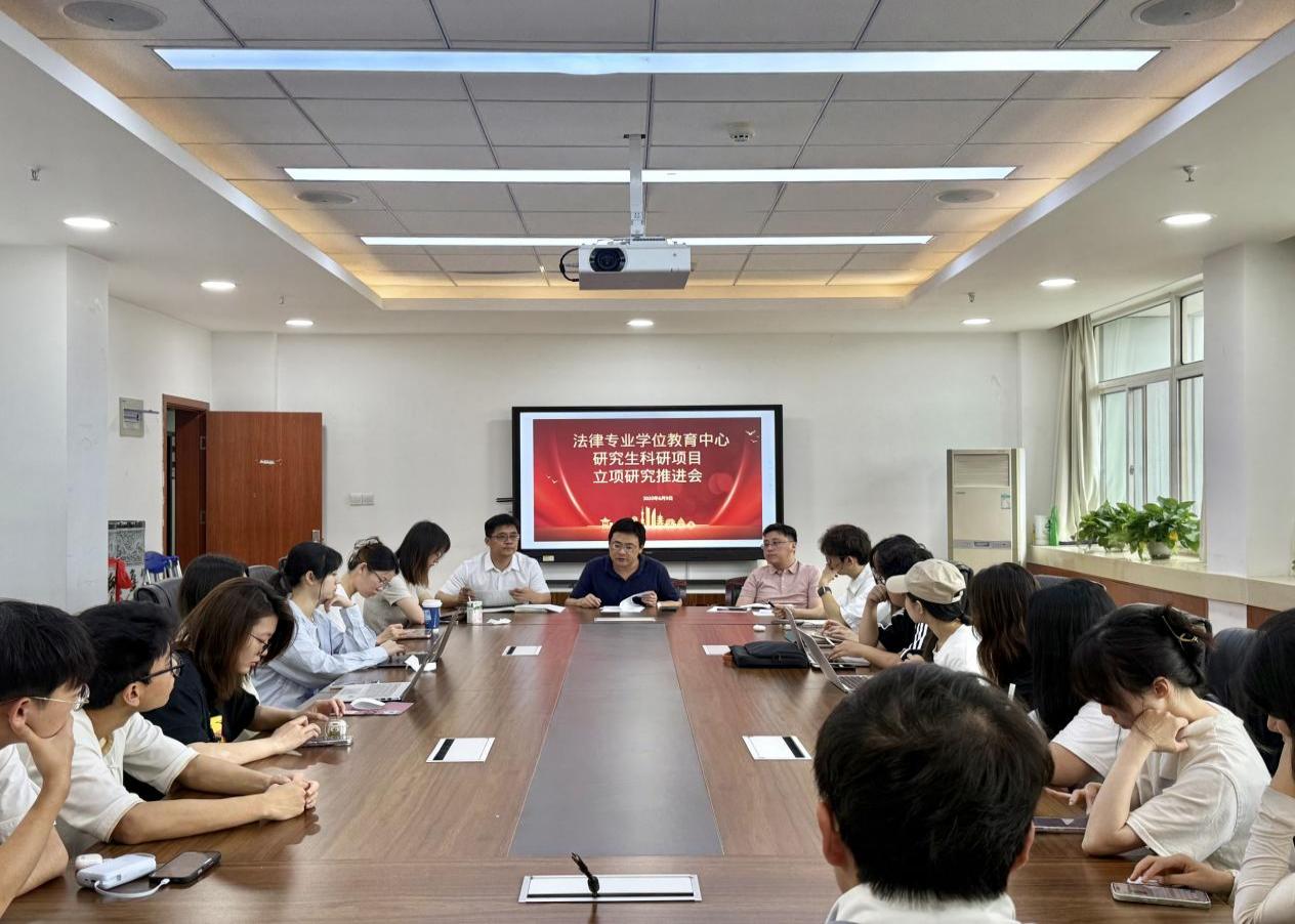 (通讯员 杨捷 乐茗绮)为进一步推进法律硕士专业学位研究生科研项目的高质量完成,提升科研育人实效,法律专业学位教育中心于6月9日召开研究生科研项目立项研究推进会。法律专业学位教育中心2025年立项全体研究生、法学院副院长兼法律专业学位教育中心副主任秦小建、副主任王广波、法律硕士(政务法治)培养方向研究生导师谭冰霖和教学秘书乐茗绮参会。