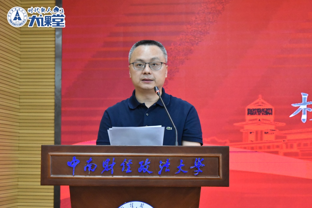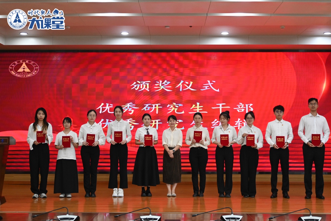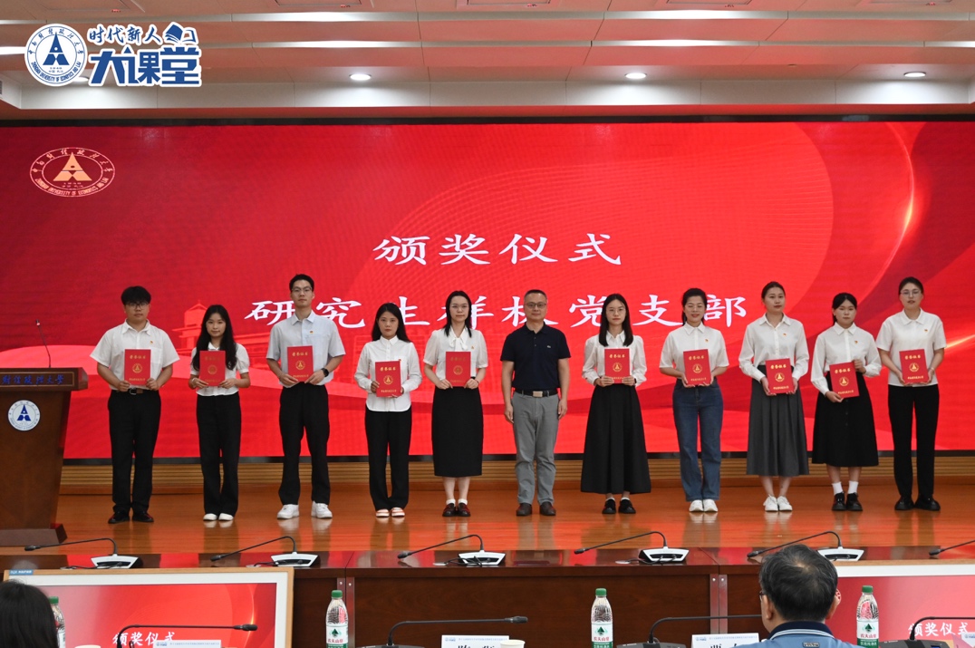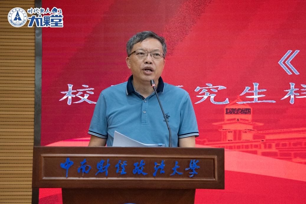 覃红副校长宣读《关于公布第四批校级研究生样板党支部、校级研究生党员标兵评选结果的通知》、《关于表彰第十五届研究生学术节先进集体和先进个人的决定》、《关于中南财经政法大学2024-2025学年研究生综合表彰的决定》三个表彰发文。