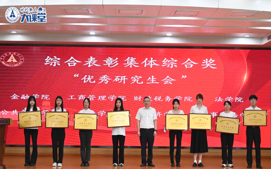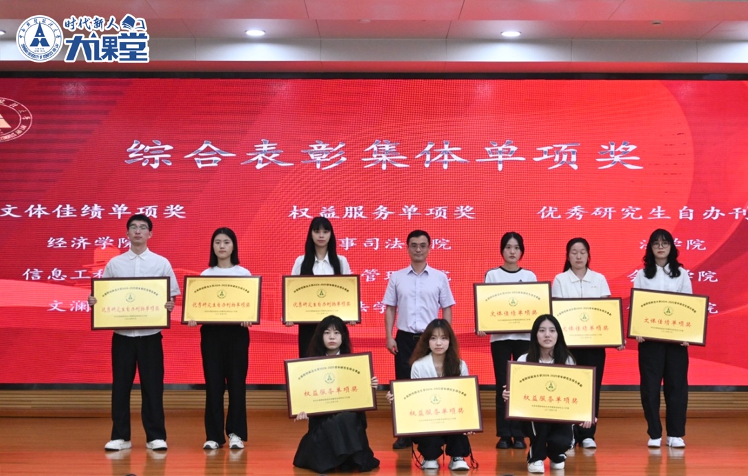 第三篇章“群星璀璨 风采华章”表彰在学生组织工作等方面表现优异的集体和个人。党委研究生工作部部长肖翠祥、校团委书记黄小妹、党委宣传部副部长邓松和研究生院副院长王华分别为获奖集体和个人颁奖。金融学院代表与法学院2023级硕士研究生吕志斌作为代表分享。