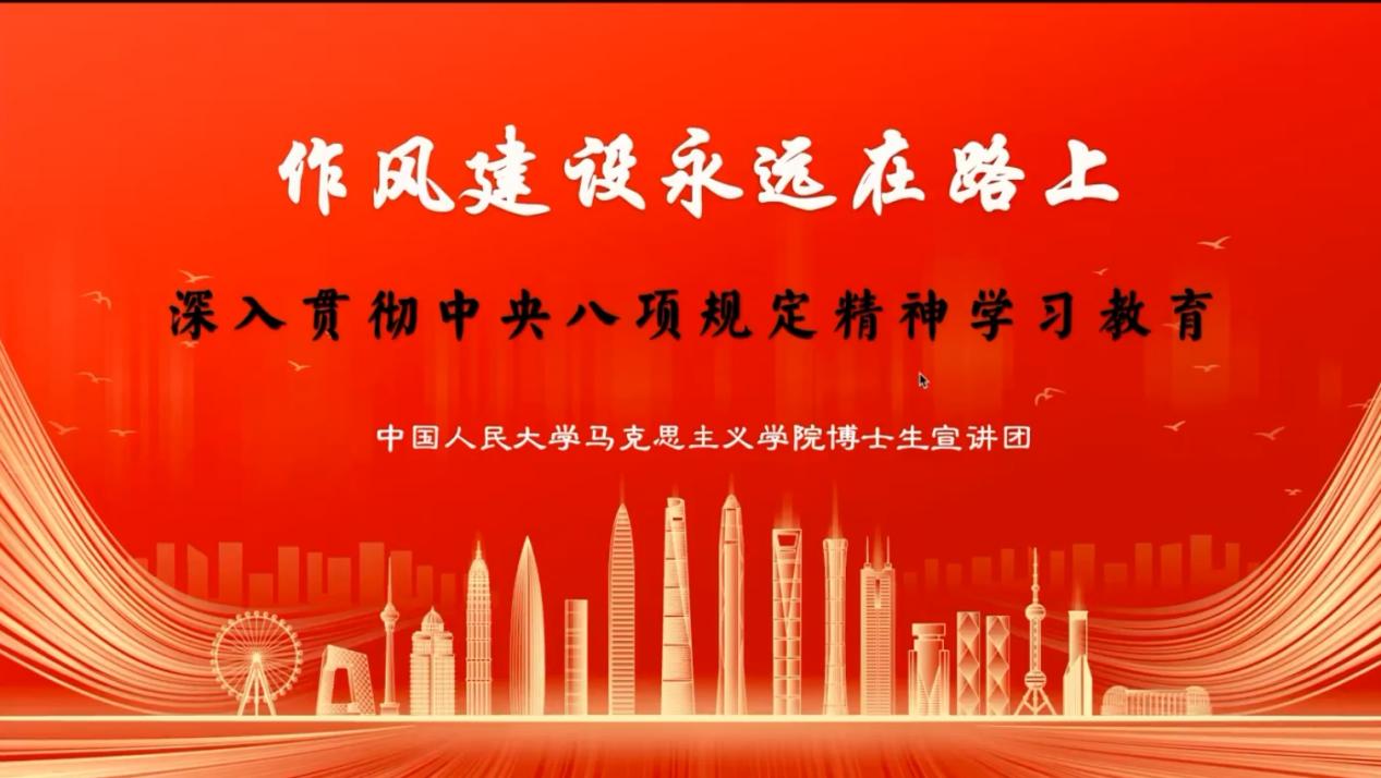中国人民大学马克思主义学院博士生宣讲团刘志铭以《作风建设永远在路上》为题率先开讲,深刻阐述了作风建设的历史必然性、长期性和艰巨性,强调其作为永恒课题的重要意义。中国人民大学马克思主义学院博士生宣讲团王妍带来题为《以八项规定之笔,写自我革命的作风长卷——中央八项规定精神的自我革命逻辑》的宣讲,聚焦中央八项规定精神,精辟剖析了其蕴含的深刻自我革命逻辑。