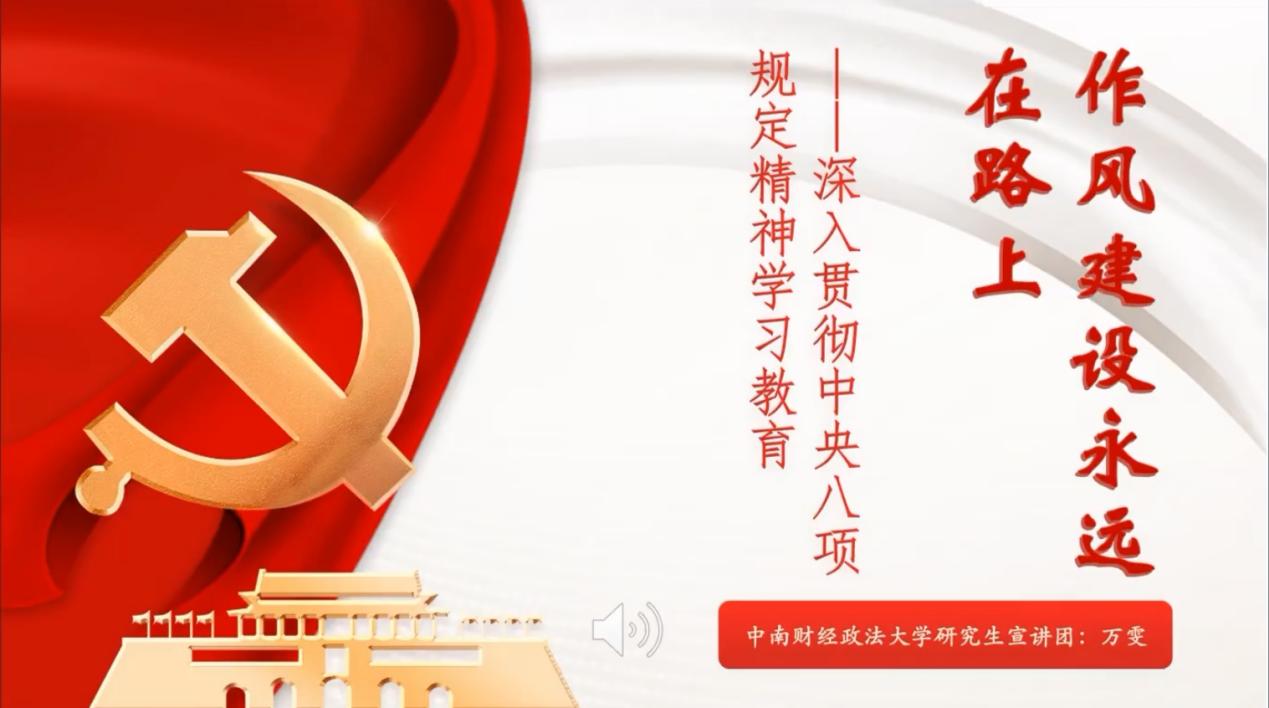 中南财经政法大学研究生宣讲团万雯带来《党的作风建设永远在路上——深入贯彻中央八项规定精神学习教育》,系统梳理作风建设的发展脉络,强调了在新征程上持续深入贯彻中央八项规定精神学习教育的必要性和紧迫性。中南财经政法大学研究生宣讲团汪婧童以《行传播之力 践中央八项规定精神》为题,探讨如何有效发挥理论传播优势,创新方式方法,身体力行地宣传和践行中央八项规定精神,推动优良作风在青年群体中蔚然成风。