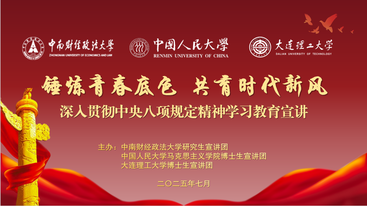 (通讯员:铁德铭)为深入贯彻中央八项规定精神、深化青年理论学习,进一步加强校际交流联动,7月12日下午,由中南财经政法大学研究宣讲团、中国人民大学马克思主义学院博士生宣讲团、大连理工大学博士生宣讲团联合开展的“锤炼青春底色 共育时代新风”三校联合宣讲活动在云端成功举办。三校青年宣讲骨干齐聚线上,围绕中央八项规定精神的深刻内涵、历史逻辑与时代价值,进行了深入的理论学习、精彩的示范宣讲与宝贵的经验交流。三校宣讲团代表、中南大研究生会党支部成员与样板研究生培育项目党支部代表参会。