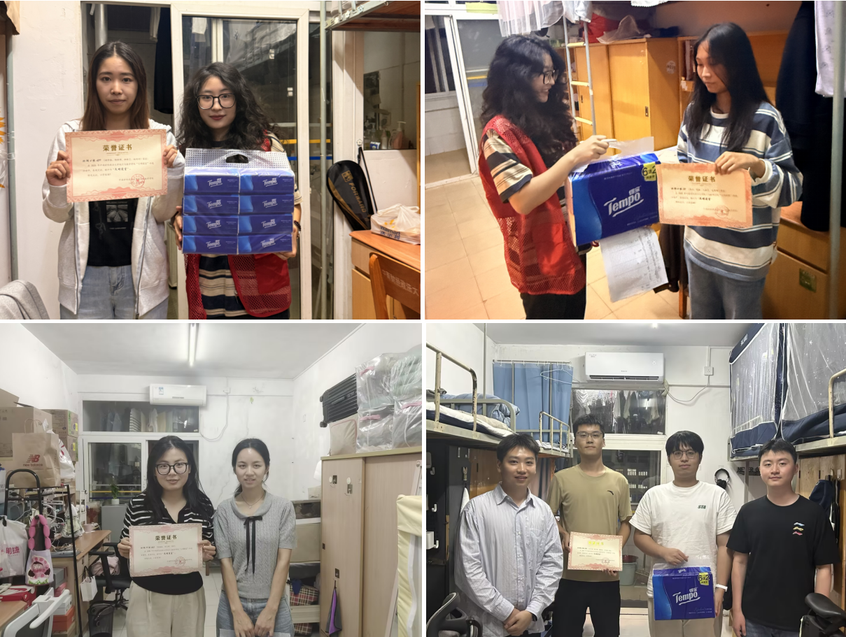 经过多轮检查与综合评分,本次活动最终评选出30间研究生文明寝室。9月26日晚,学院研究生会指导老师吴志伟携生活权益部成员走访了获奖寝室,为获奖寝室颁发荣誉证书及生活用品。在走访过程中,吴老师与同学们亲切交谈,详细询问寝室日常学习生活情况,对获奖寝室展现出的整洁环境、和谐氛围与积极向上的精神风貌给予高度评价,同时勉励获奖同学持续发挥示范引领作用,通过经验分享、互助共建等方式带动更多寝室提升文明素养,共同进步。