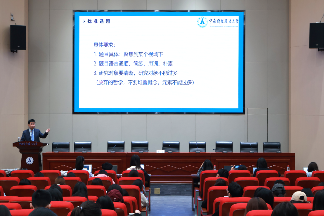 (通讯员:张瀚文 龙梦凤)2025年10月23日晚,中南财经政法大学法学院副教授、硕士生导师郭航老师在中南财经政法大学法学科研大楼大报告厅主讲第364期“文澜大讲堂”之名家讲坛——研究生科研项目申报技巧。本次讲座由中南财经政法大学研究生院、党委研究生工作部、中南财经政法大学研究生会、研究生学术创新中心主办,中南财经政法大学法学院、中南财经政法大学法学院研究生会承办,围绕科研项目申报的全流程,深入讲授了精准定位项目选题、科学设计研究框架与规范撰写申报材料的技巧,旨在帮助同学们提升申报书撰写能力与科研项目竞争实力。