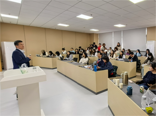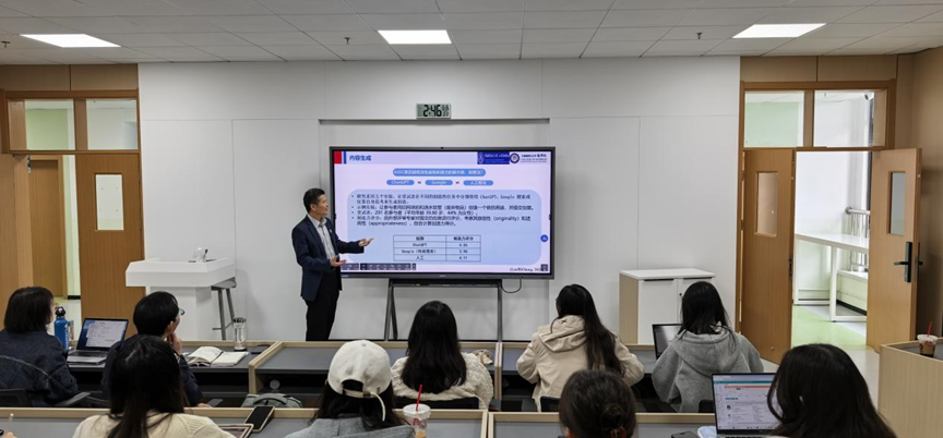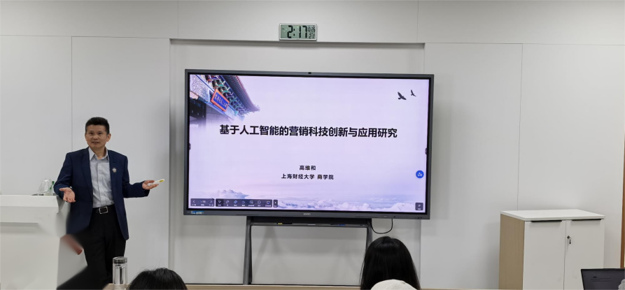 讲座过程中,高维和教授结合行业实践与学术观察,指出当前智能营销面临的三大挑战。结合国内外核心文献,梳理了AI在营销领域的四大研究热点及成果。基于现有研究,高维和教授提出“五位一体”的智能营销研究框架,为师生搭建了清晰的理论分析体系。随后,他通过对比分析式营销与AIGC营销的差异,指出AIGC技术正推动营销领域发生工具、内容、体系三大方面的转变。最后,谈及未来发展,高维和教授对师生提出接纳技术以促进效率提升,以及回归营销本质,实现“技术技能”与“专业素养”协同提升的两点核心建议。