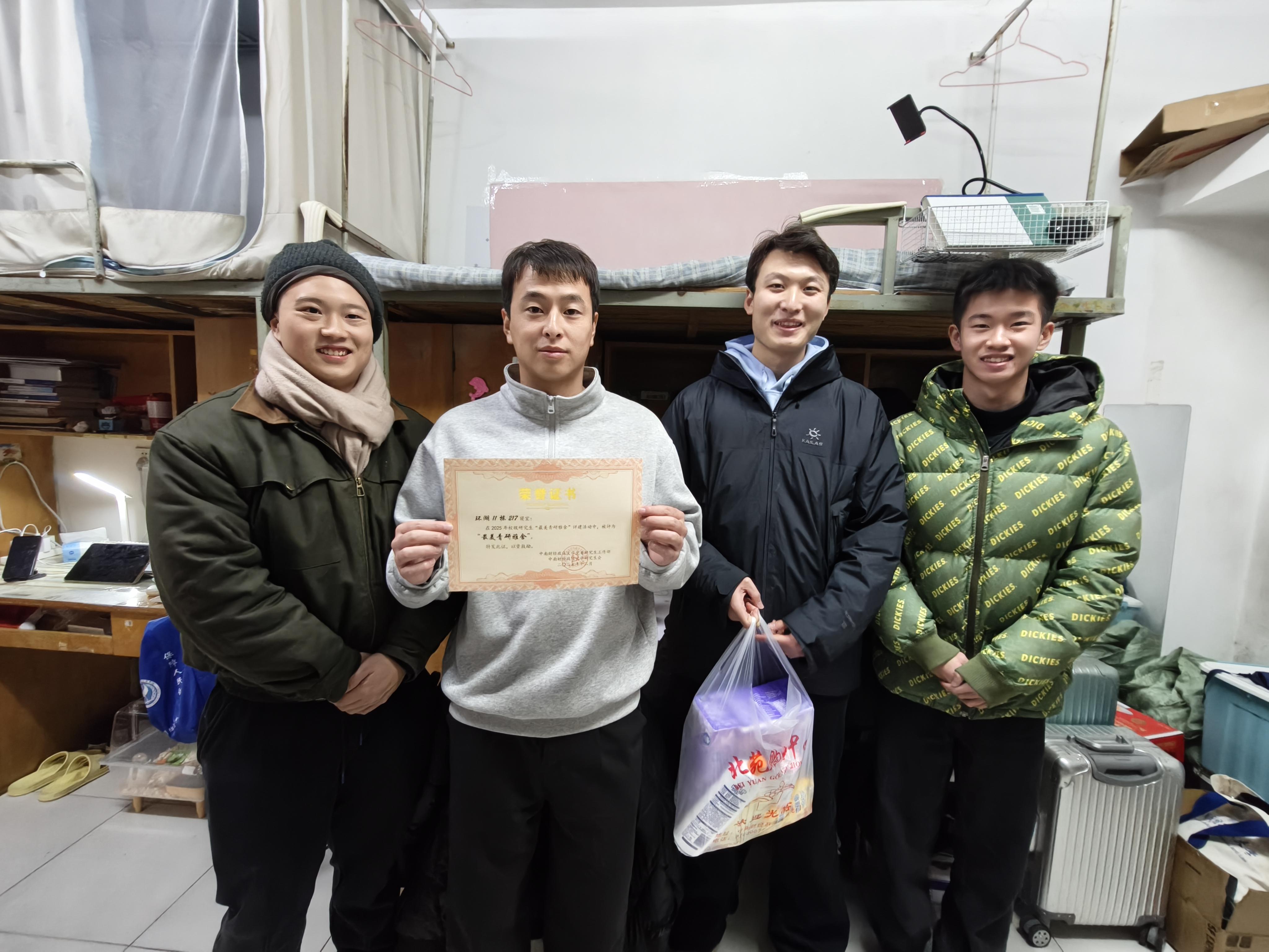 在“最美青研雅舍”获奖宿舍走访中,王晓丹和研会成员为获奖同学颁发荣誉、送上祝福。辅导员王晓丹在表彰现场谈到,获奖宿舍凭借整洁的环境、良好的氛围和文明的风尚脱颖而出,生动展现了学院研究生积极向上的精神风貌,她勉励获奖宿舍要珍惜荣誉、再接再厉,充分发挥示范引领作用,带动身边更多同学重视宿舍环境建设。同时,学院将持续关注同学们在宿舍生活中的各类合理需求,不断优化服务保障,努力为同学们打造更优质的住宿条件和成长环境。