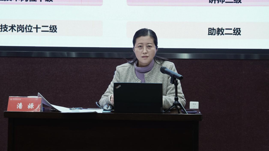 人事部副部长潘嫄介绍了学校思政系列相关制度修订工作考虑,重点解读了与辅导员职业发展密切相关的政策内容。