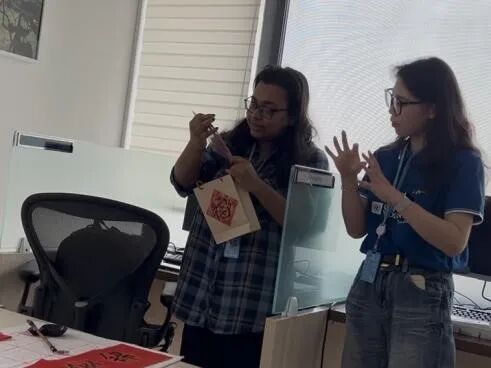 在文化体验环节,办公室变成了一处小型的中国传统文化课堂。大家亲手制作翻花龙,在纸张的翻转与展开中体会民间艺术的巧思与灵动。色彩在指尖流动,传统元素在互动中鲜活起来。