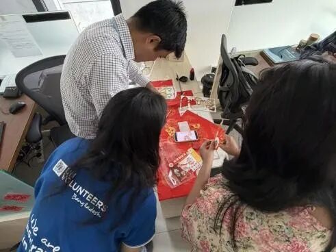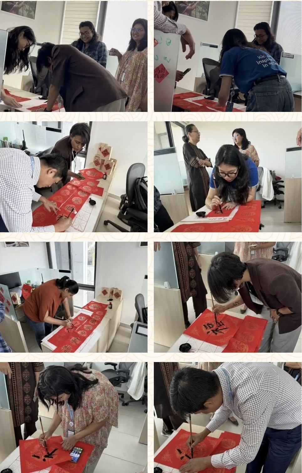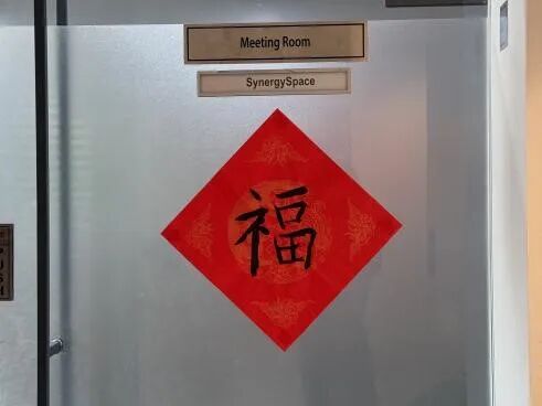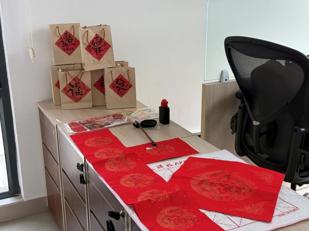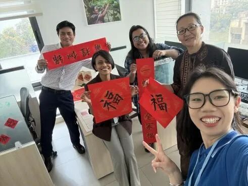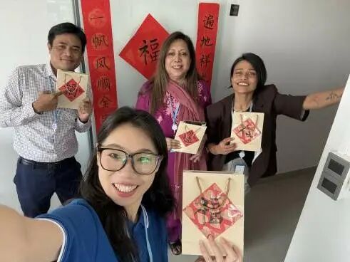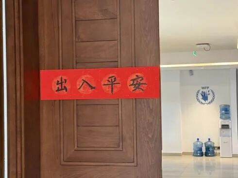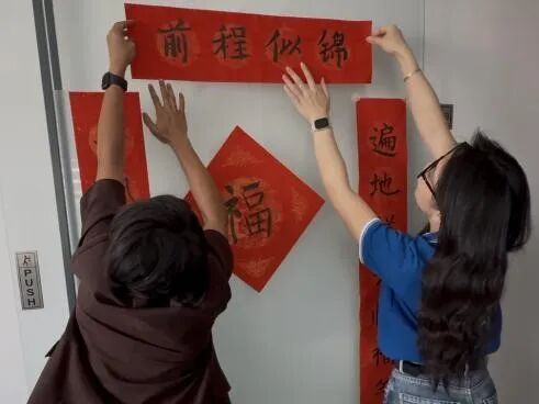 随后,大家一同将春联贴在办公室区域。红色的纸张在国际组织的办公环境中格外醒目,为办公室增添了喜庆的色彩,让忙碌的工作空间多了一份温暖与节日仪式感。