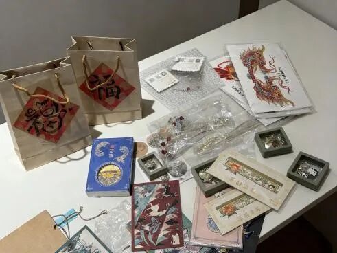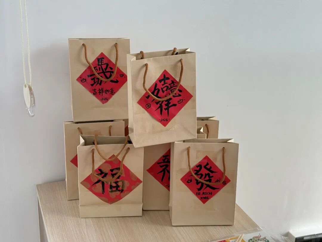 活动最后,她为同事们准备了用心制作的新年礼物。礼物袋由她亲手设计与制作,袋面贴上了自己书写的毛笔字,让每一份礼物都带着独特的中国元素。袋中装有熊猫钥匙扣、文创书签、融合中国传统文化与非遗元素的明信片、胸针、冰箱贴、熊猫杯垫、刺绣钱包以及发簪等小物件。每一样都经过精心挑选,希望通过具体而可触摸的物品,让大家在日常生活中继续感受中国文化的温度。