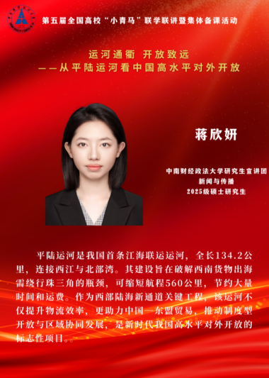 蒋欣妍以《运河通衢开放致远——从平陆运河看中国高水平对外开放》为主题,从改革开放的发展历程切入,梳理了中国从要素流动型开放向制度型开放的转变,聚焦广西平陆运河这一国家重大工程,从“为何修”“为何能修”“何为价值”三个维度展开阐释,并将平陆运河的建设与京津冀、上海自贸试验区、粤港澳大湾区的开放实践相联系,展现了中国全域联动、全方位推进高水平对外开放的生动格局,号召青年学子在对外开放的时代浪潮中找准自身定位,贡献青春力量。