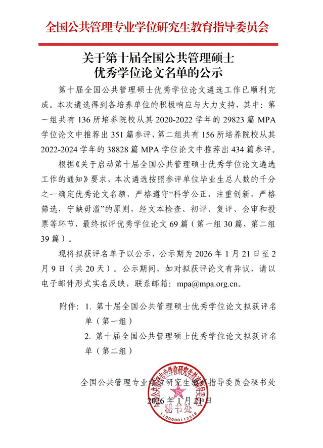 全国MPA优秀学位论文评选是国内公共管理专业学位领域层次最高、含金量最足、影响力最大的评选活动,代表着我国MPA研究生教育的顶尖水准。本届评选覆盖全国近300所MPA培养单位,从2020-2024学年超6.8万篇学位论文中初筛785篇进入参评环节,经文本审核、专家评审、综合会审等多轮严格遴选,最终69篇获评优秀。我校两篇论文凭借扎实的研究基础、鲜明的问题导向与突出的实践价值,在激烈竞争中脱颖而出,充分彰显了我校MPA人才培养的过硬实力。