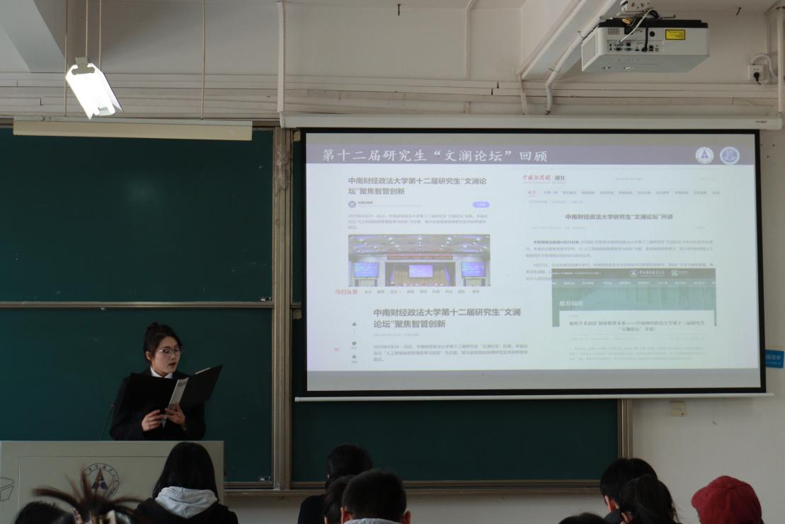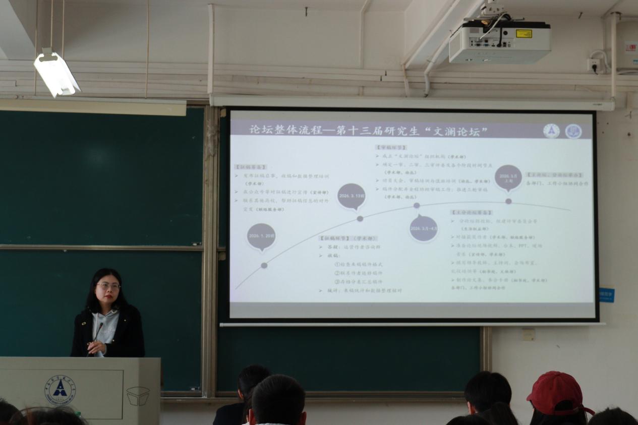 会议伊始,第十三届“文澜论坛”组委会(筹委会)委员、校研究生会主席周文倩发言。她带领大家回顾历届论坛的概况,介绍了本届论坛“三阶段、两步走、七组织”的工作模式,针对本届论坛征稿筹备、后续审稿环节、主分论坛现场安排等工作进行了详细说明,号召各工作小组通力合作,细化分工,持续推进论坛筹备工作有序开展。