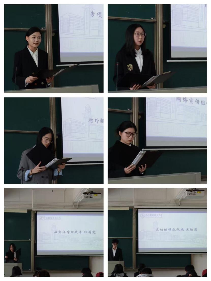 第十二届研究生“文澜论坛”组委会(筹委会)日常工作小组代表依次发言,汇报各组前期工作进展及后续安排。综合协调组代表李依潼详细介绍稿件收集整理工作,汇报论坛整体策划方案、分论坛组织工作;网络宣传组代表谈立奥从物料制作、新闻采写、平台运营等方面汇报论坛线上线下宣传工作情况;对外联络组代表孙婧怡汇报与全国各高校及其专家学者的联络进展,介绍嘉宾对接、参观事宜;文档编辑组代表王陆岩介绍论坛文稿工作撰写安排、建立文稿把关“闭环机制”确保会议材料质量;后勤保障组代表邓蔚雯围绕论坛期间参会人员食宿、交通及会务保障等方面做汇报;专项事务组代表李晓阳汇报论坛接待及颁奖仪式环节等专项事务。