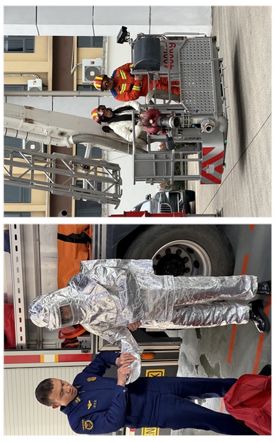 抵达高新消防救援站后,消防员带领支部党员对各类消防车辆与器材装备进行集体参观,并逐一讲解了其功能用途以及在灭火救援任务中的实际应用。在消防员陪同和专业人员的指导下,刘祖霖、丁楠两位同志分别试穿了隔热防火服和水域救援背心,游晓彤、袁子仪两位同志进行了高空作业体验,通过“零距离”接触与“沉浸式”体验,切身感受消防员在极端环境下执行任务的艰辛与不易。大家既惊叹于消防装备的强大性能,也真切感受到消防员高空作业的勇气与不易,对消防员的心理素质和专业技能表示由衷敬佩。