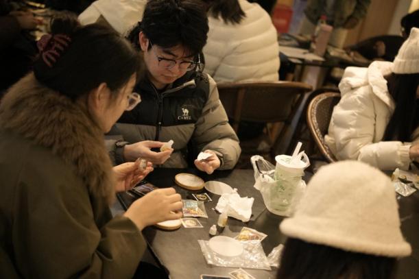 在轻松愉悦的氛围中,干花杯垫DIY创作正式开启。同学们根据个人审美与创意巧思,自主挑选缤纷多彩的干花素材、特色贴片,在白色卡纸上精心排布花材。